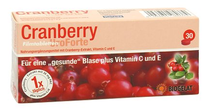BIOGELAT® UroForte Cranberry Filmtabletten ist ein Nahrungsergänzungsmittel, das dazu bestimmt ist die tägliche Ernährung mit einem hochwertigen Extrakt aus der Cranberry-Frucht und den Vitaminen C und E gezielt zu ergänzen. Die Cranberry-Frucht enthält viele wertvolle Inhaltsstoffe. Ein spezielles Konzentrationsverfahren bei der Extraktherstellung gewährleistet die Menge von 36 mg Proanthocyanidinen (PAC) in einer Filmtablette. BIOGELAT® UroForte Cranberry Filmtabletten enthalten zudem die Vitamine C und E. Vitamin C und E tragen dazu bei, die Zellen vor oxidativem Stress zu schützen. Zusätzlich unterstützt Vitamin C die normale Funktion des Immunsystems.