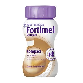Fortimel Compact ist eine hochkalorische Trinknahrung in einer besonders kleinen 125 ml Portion mit der derzeit höchsten Energie-und Nährstoffdichte (2,4 kcal/ml). Fortimel Compact ist voll bilanziert. D.h. alle essentiellen Nährstoffe und lebenswichtigen Vitamine, Mineralstoffe und Spurenelemente sind im ausgewogenen Verhältnis enthalten, so dass man sich mit Fortimel Compact sogar ausschließlich ernähren könnte. Eine 125 ml-Flasche Fortimel Compact enthält 300 kcal und 12 g Eiweiß.