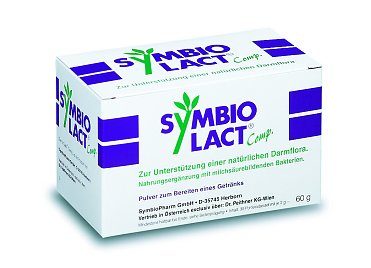 1 Portion SymbioLact® Comp. (1 Beutel) enthält eine Mischung gefriergetrockneter Milchsäure-bakterien des oberen und unteren Verdauungstraktes mit einer Gesamtkeimzahl von ≥ 1 x 109 KBE (Kolonie bildende Einheiten) pro Gramm. Diese Mischung setzt sich zusammen aus den Stämmen Lactobacillus paracasei, Lactobacillus acidophilus, Lactococcus lactis und Bifidobacterium lactis.